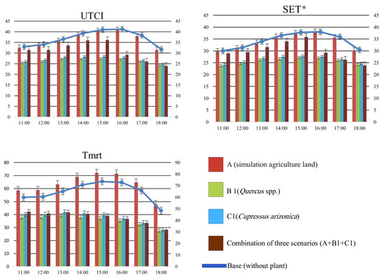 Performance of plants scenario related to canopy width and height, 1.8 m, 8 h (10:00–18:00 LST). Error bars represent the standard error (SE) of hourly simulated values from 10:00 to 18:00 LST, calculated across all grid points within each scenario at the same site.