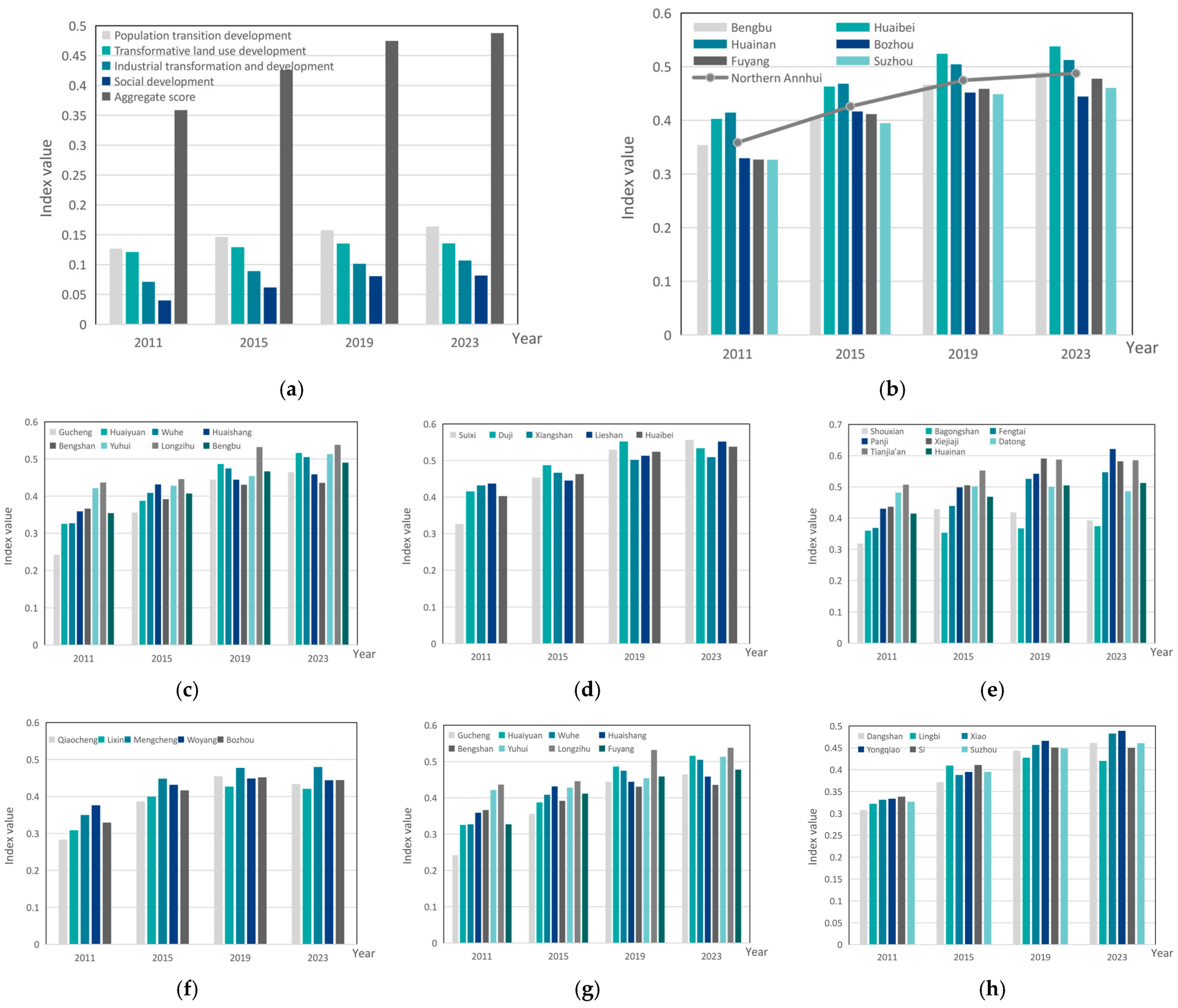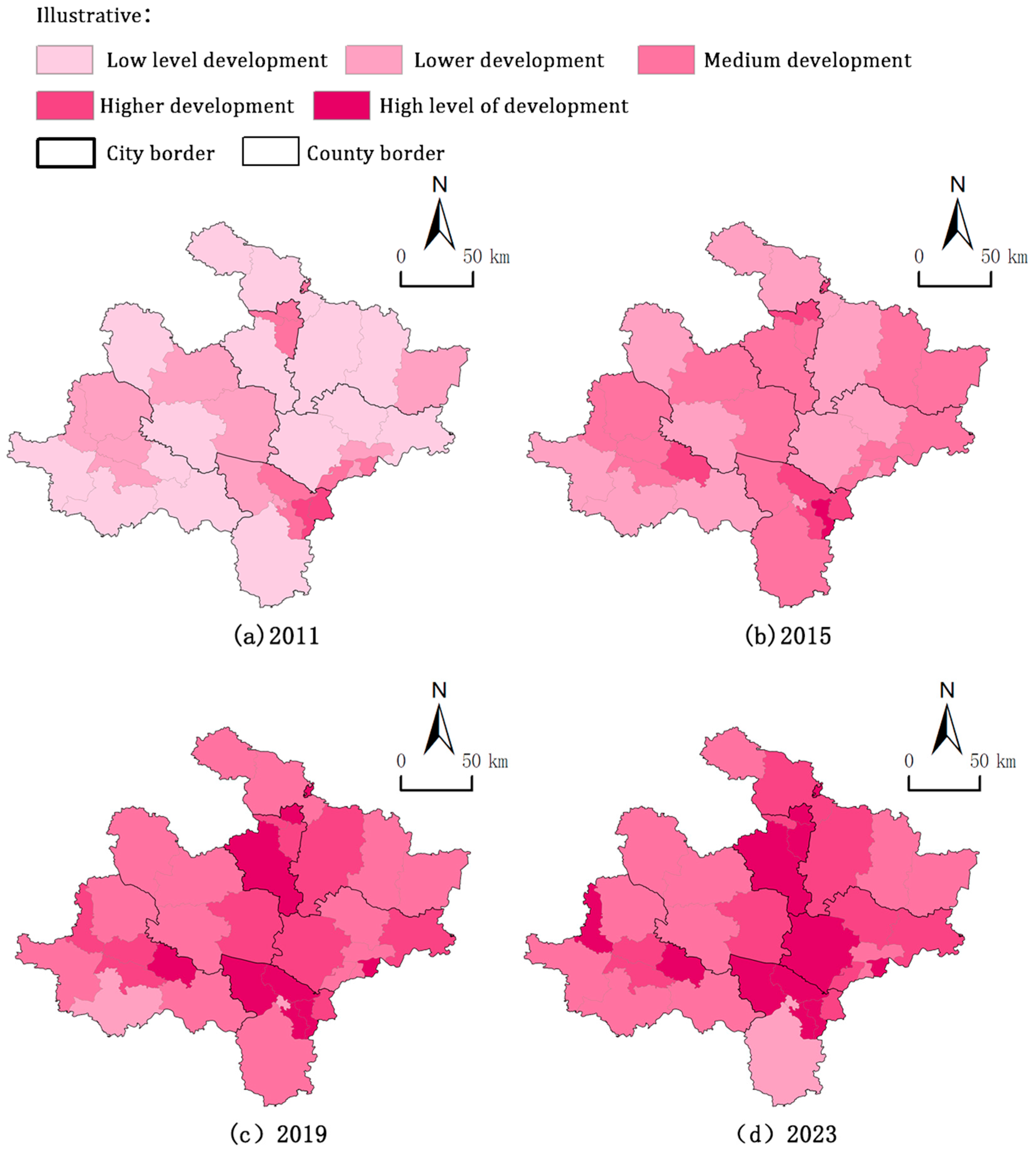 - Stable but differentiated transformation: Over the past decade, the level of rural transformation in the Northern Anhui region has shown a clear and overall upward trend (over 35% growth). However, the spatial pattern has been uneven, with a predominantly low level in the early period gradually evolving into a structure of “high in the center and low in the periphery”, and the differences between counties have narrowed;