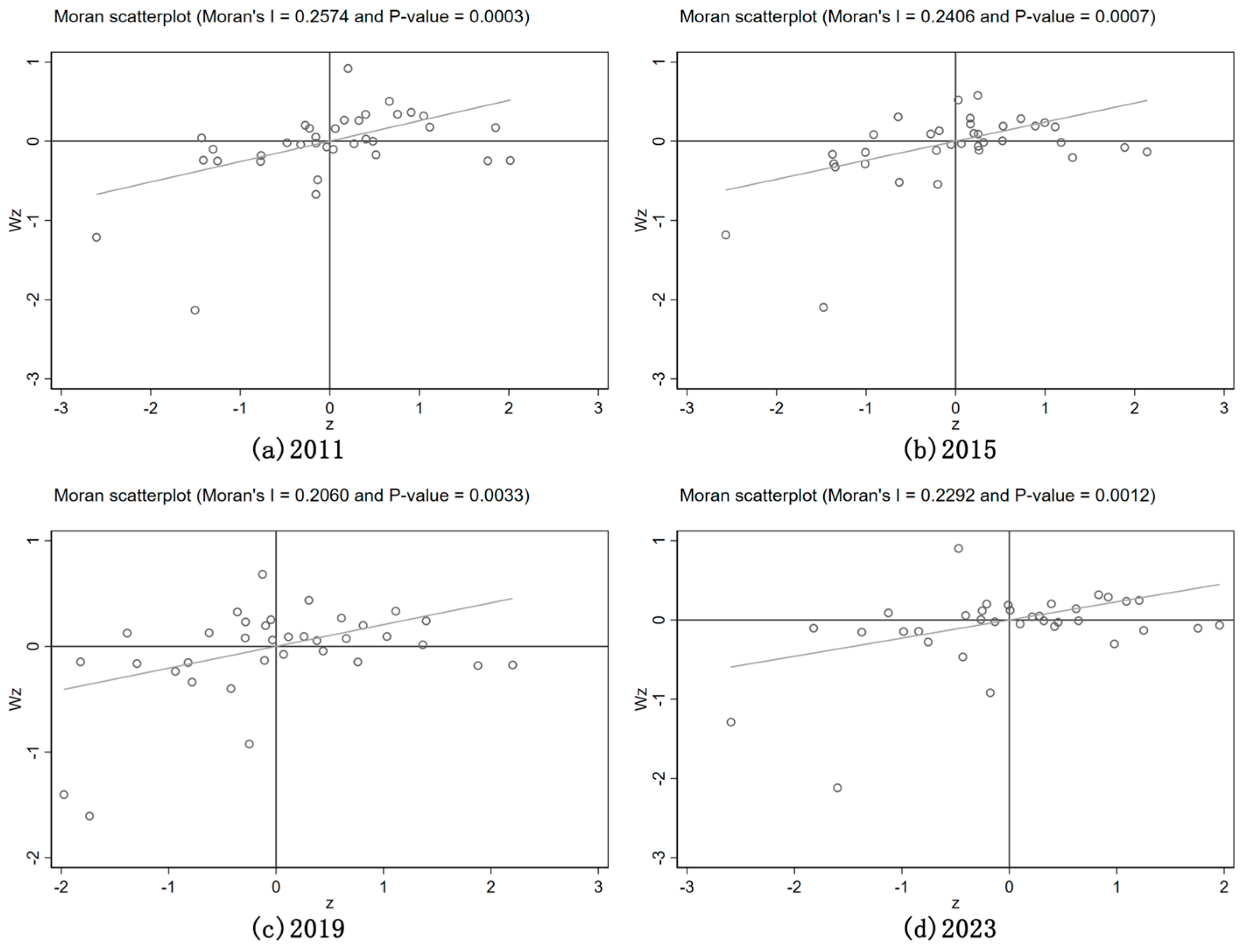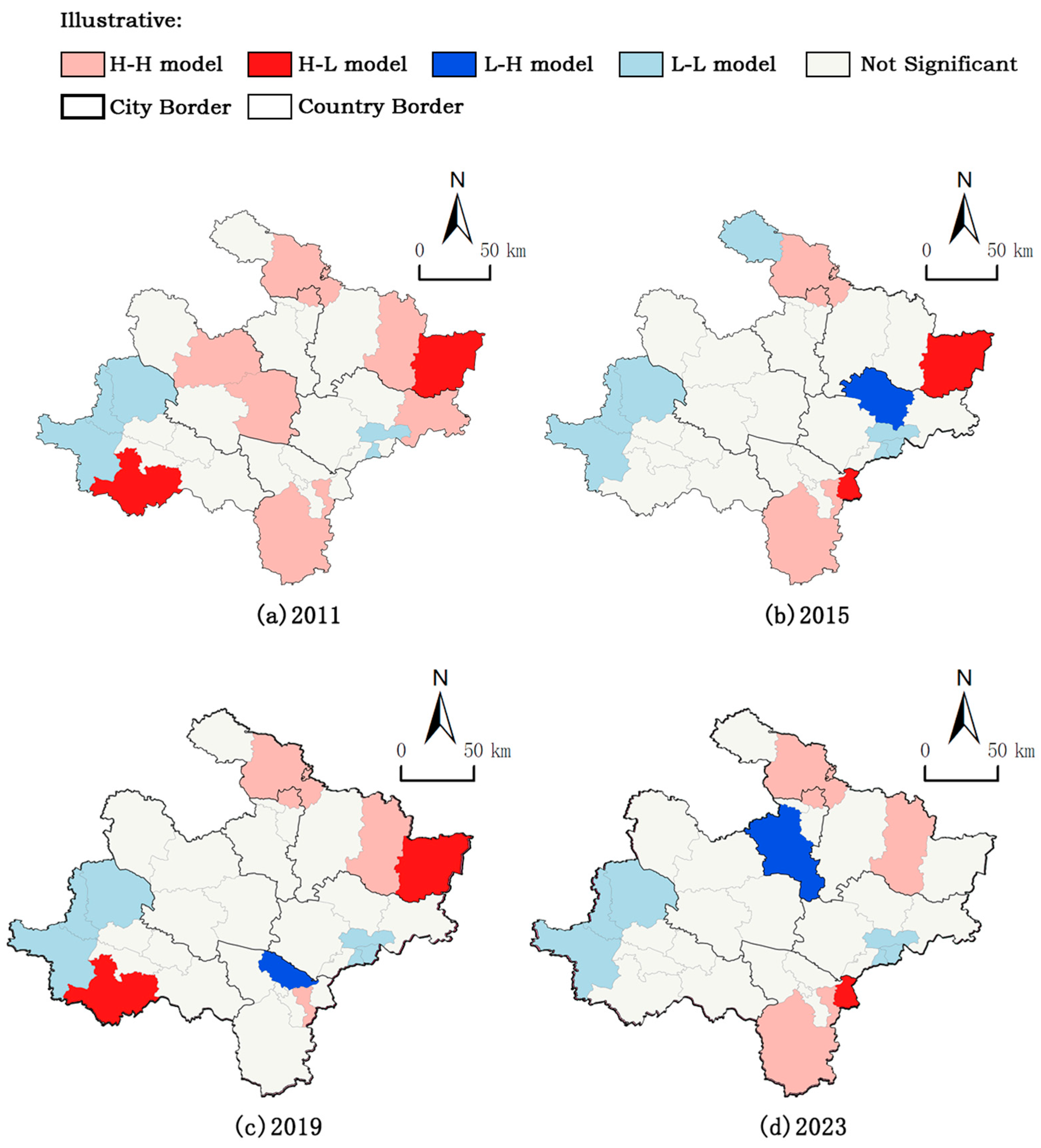 - Spatial dependence: There is a strong positive spatial autocorrelation in Northern Anhui, and the local spatial analysis reveals a stable pattern of coexistence of high-value aggregation and low-value aggregation zones, reflecting the influence of initial conditions and spatial spillovers;