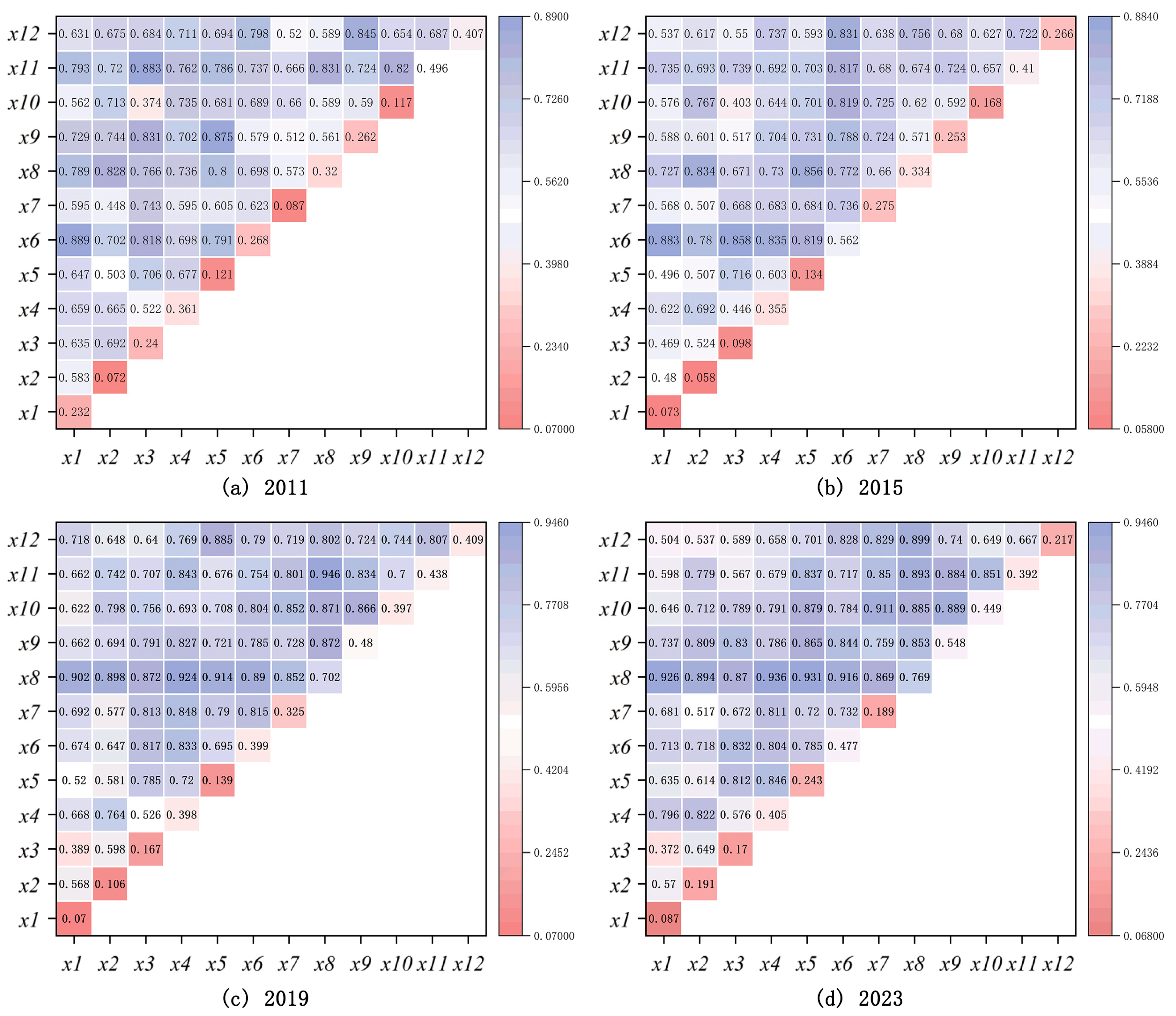 | X8 | 0.320 ** | X8 | 0.334 ** | X12 | 0.409 ** | X10 | 0.449 ** |
