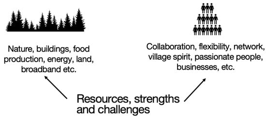 The results of the study in Sysslebäck demonstrate how in-depth interviews can identify both tangible and intangible resources (see Figure 5). The interviews uncovered specific needs and challenges, as well as strengths and resources to be leveraged. Concrete resources such as empty premises or the surrounding nature were recognised as potential assets for future development. Participatory observations supported this. The identity of the place, the willingness to collaborate, the enthusiasm, and the networks were emphasised as strengths and opportunities for development and future planning.
