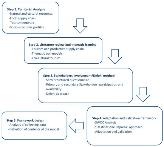 The development of the thematic trail framework followed a multi-phase approach, integrating several different techniques. The main phases of the methodology can be listed as follows: Step 1 (Territorial Analysis); Step 2 (Literature Review and Thematic Framing); Step 3 (Stakeholder Involvement/Delphi Method); Step 4 (Adaptation and Validation Framework); Step 5 (Framework Design).