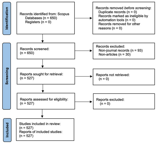 The initial query yielded 650 records. 93 non-journal records and 30 non-article records were excluded, leaving 527 records for screening. Screening and eligibility were assessed at the metadata level (titles, abstracts, and keywords), as is standard in bibliometric analysis. No further exclusions were required, and the final dataset comprised 527 journal articles, which formed the basis for subsequent bibliometric analysis.