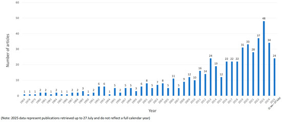 Figure 2 shows an upward trajectory in research output on soil erosion in protected areas since the first article appeared in 1969. Prior to 1991, output remained minimal, rarely exceeding five articles per year. This early stage likely reflects the narrow research scope of the period, when soil erosion was studied primarily in agricultural or watershed contexts rather than within conservation areas [3,15,16].