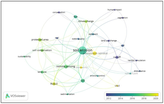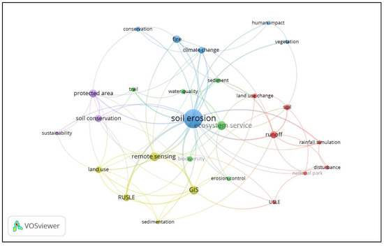 Co-occurrence clusters of keywords on soil erosion in protected areas. (Note: Colors indicate the cluster membership assigned by VOSviewer to group related keywords).