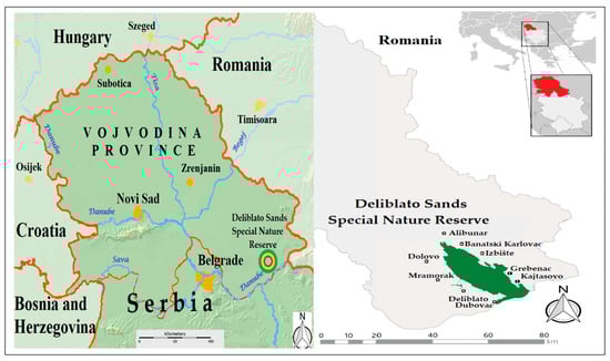 The DSSN is in southeastern Vojvodina (Northern Serbia). It is located on the very border of Vojvodina and the Danube District. The border is formed by the Danube River. Near the reserve are the towns of Kovin, Bela Crkva, Pančevo, Alibunar, Vršac, Bela Crkva, Belgrade and Požarevac [50]. The proximity of the state border with Romania, Bulgaria, and other European corridors makes DSSN a favorable geographical position.
