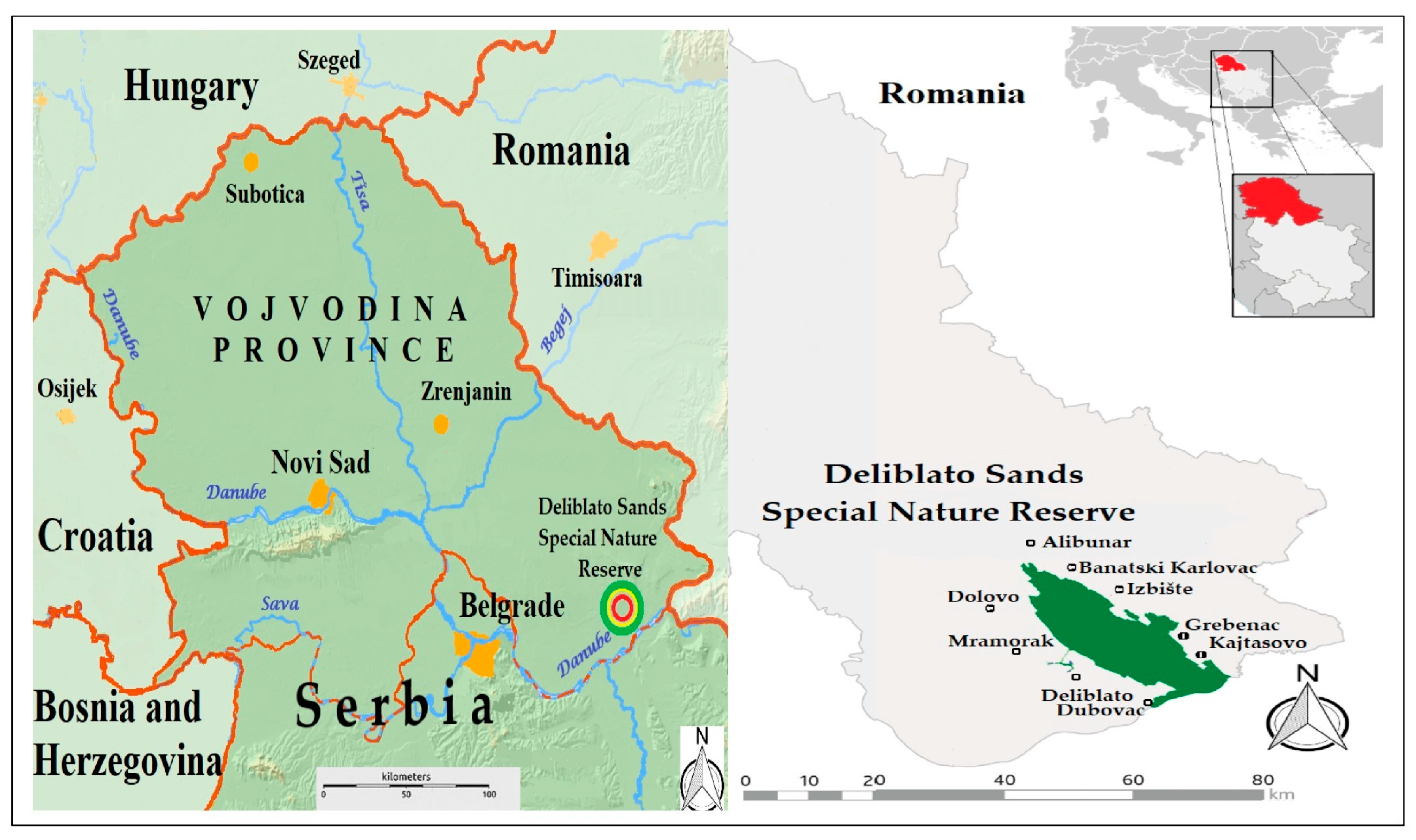 - Puzović, S.; Panjković, B.; Tucakov, M.; Stojnić, N.; Sabadoš, K.; Stojanović, T.; Vig, L.; Marić, B.; Tešić, O.; Kiš, A.; et al. Upravljanje Prirodnom Baštinom u Vojvodini (Natural Heritage Management in Vojvodina); Pokrajinski Sekretarijat za Urbanizam: Novi Sad, Serbia, 2015. [Google Scholar]