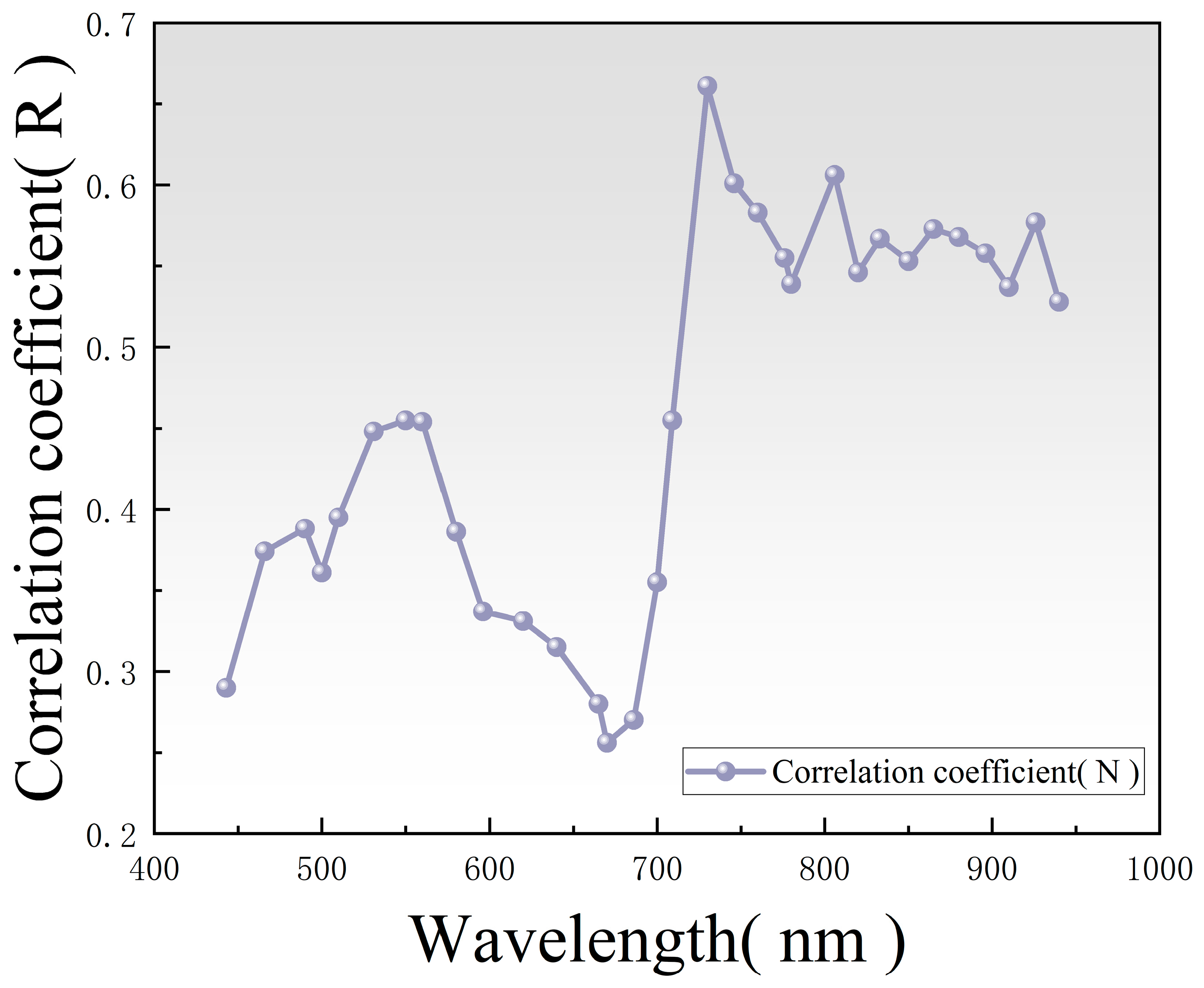 Figure 4, this study found varying degrees of correlation between soil nitrogen content and multiple hyperspectral bands. In particular, bands around the 730 nm region exhibited stronger correlations with soil nitrogen content. Moreover, correlation peaks were observed in the 500–600 nm and 700–800 nm ranges, which is consistent with findings from previous studies [