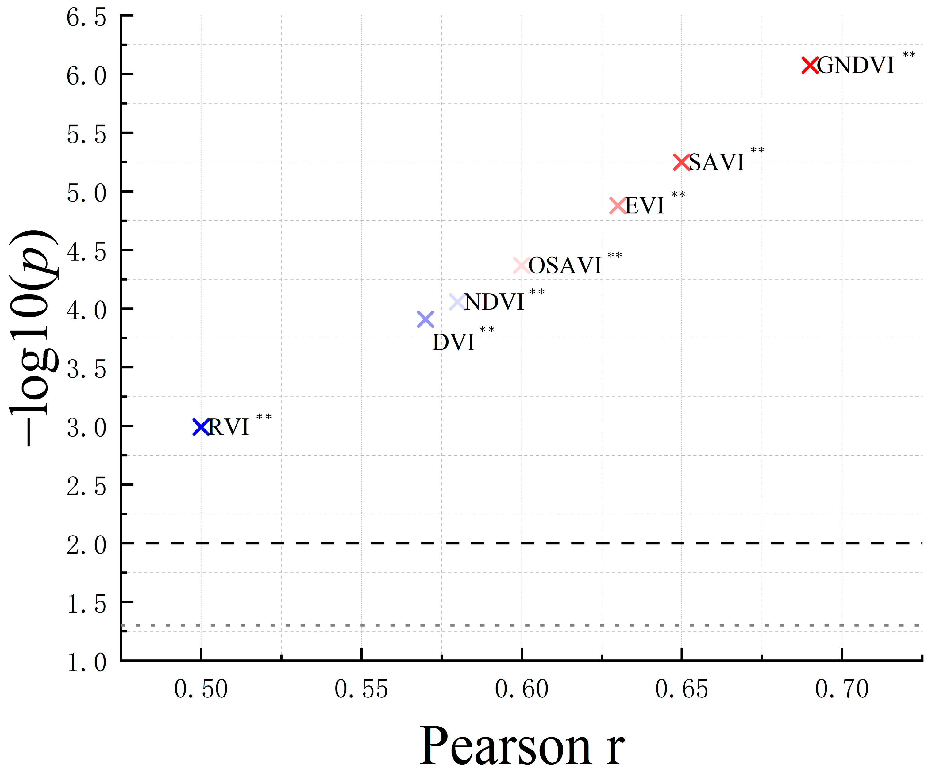 SAVI (Soil Adjusted Vegetation Index) performs relatively weakly in this study. Although SAVI helps reduce soil background interference, its correlation with soil nitrogen is lower, with a Pearson correlation coefficient of 0.32. The log10(p) value exceeds 1.3, and its p-value reaches 0.05 but does not meet the 0.01 threshold, indicating limited statistical significance. As a result, its application in soil nitrogen estimation is less effective.