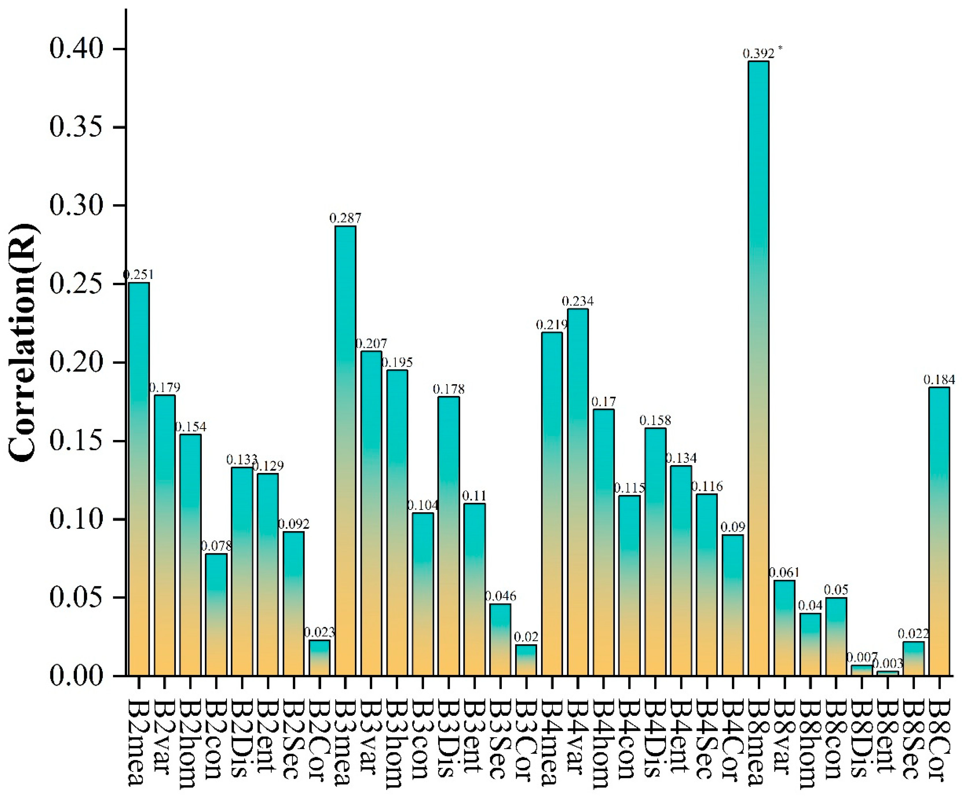 Eight texture features were extracted from four Sentinel-2 multispectral bands using the gray-level co-occurrence matrix, and their correlations with nitrogen content were then established, as shown in