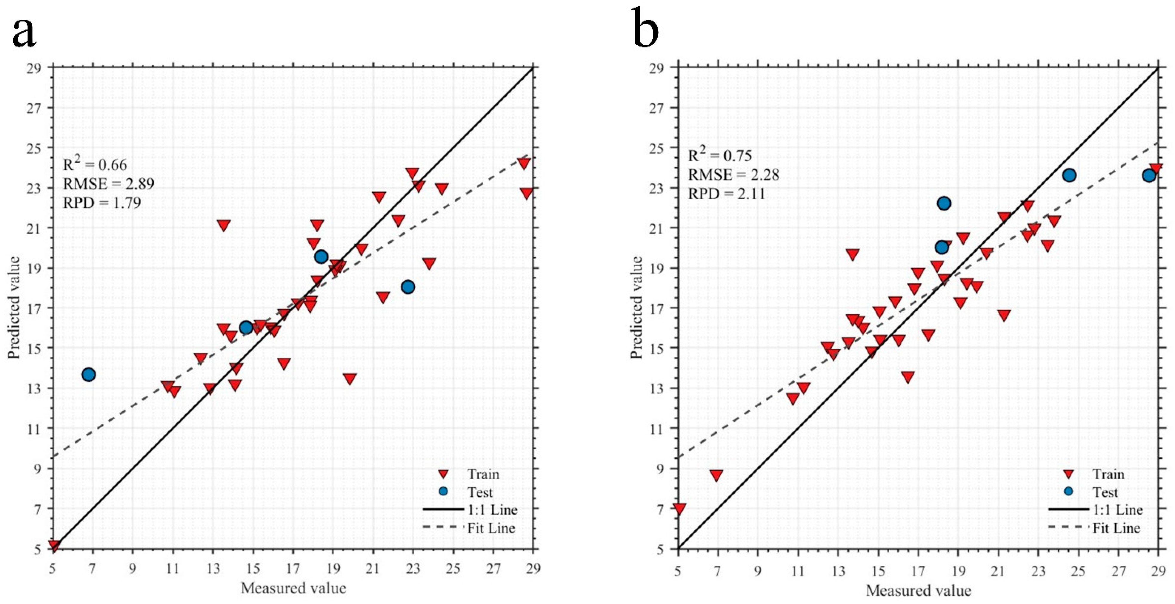 Table 7 demonstrate that texture indices derived from the combination of multiple texture features exhibit stronger correlations with soil nitrogen. This indicates that incorporating texture indices can improve the inversion accuracy of soil nitrogen.