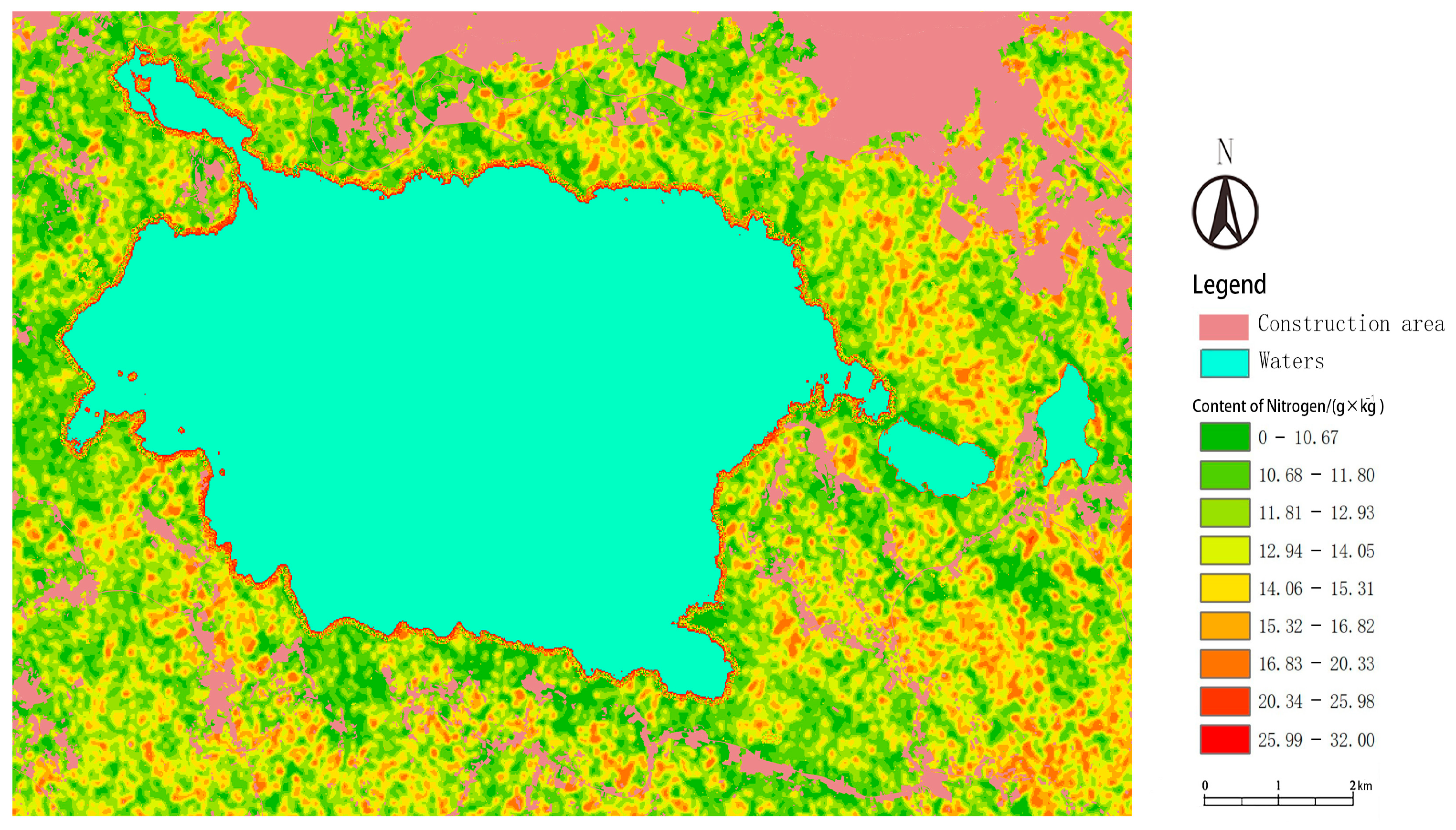 Following closely, GNDVI (Green–Red Vegetation Index) is another prominent index. GNDVI uses the ratio of the green band to the near-infrared band to reflect the photosynthetic capacity and moisture status of vegetation. Its Pearson correlation coefficient is also close to 0.4, indicating a positive correlation with soil nitrogen, and it demonstrates high statistical significance. This suggests that GNDVI is effective in reflecting the spatial variation of soil nitrogen content and is a powerful tool for soil nitrogen monitoring.