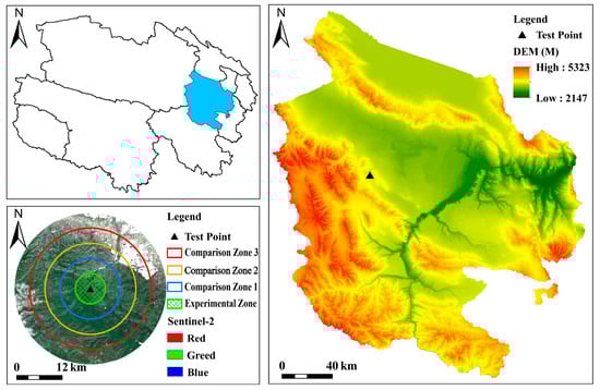 Hainan Tibetan Autonomous Prefecture is located at the junction of Qinghai Province’s pastoral areas and eastern agricultural regions. Situated in the eastern Qinghai–Tibet Plateau and southwestern Qinghai Province, the prefecture features predominantly mountainous terrain surrounded by ranges on all sides, with an average elevation exceeding 3000 m. The region experiences a typical highland continental climate characterized by aridity, low annual rainfall, intense solar radiation, poor thermal conditions, and significant climatic variation. Xinghai County, administered by Hainan Prefecture, exhibits higher elevations in the southwest and lower elevations in the northeast. Its central and southern areas contain numerous rivers with abundant forests and well-developed vegetation, while the northern region features relatively flat, open terrain with extensive pastureland. The county lies within the geographical coordinates of 34°48′–36°14′ N and 99°01′–100°59′ E, positioning it within the core area of both the “Three Rivers Source” National Natural Ecological Protection Area and the “Qinghai Lake” Ecological Protection Area. The local economy primarily relies on livestock farming, supplemented by agriculture. Figure 1 illustrates the geographical locations of the study area, experimental zone, and comparison zone, along with the corresponding Sentinel-2 remote sensing imagery.