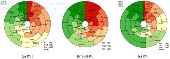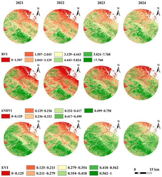 Using the acoustic rain enhancement experiment site as the center and a radius of 16 km, the circular zone depicted in Figure 2 shows the spatial distribution maps of the three vegetation indices—RVI, kNDVI, and EVI—from 2021 to 2024, with the values of the three indices categorized into grades.