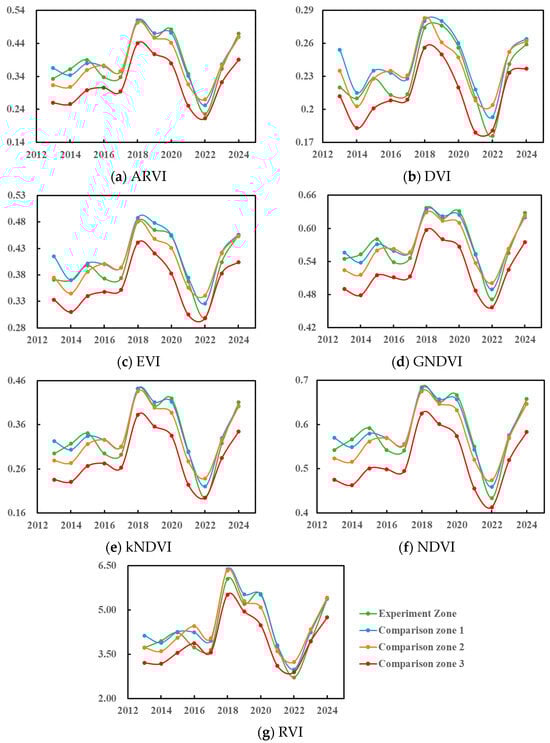 Since the Sentinel-2A satellite was not successfully launched until 2015, in order to analyze the variation characteristics of vegetation indices over a long-term time series before the acoustic rain enhancement experiment. Based on the analysis of 7 vegetation indices using Landsat 8 remote sensing data during the historical period (2013–2022) and the acoustic rain enhancement period (2023–2024) (Figure 4), the results indicate that the experimental zone and the three comparison zones exhibit significant spatial heterogeneity in the temporal changes in the differences in the 7 vegetation indices.