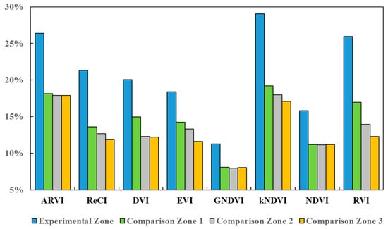 Relative increase rate of eight vegetation indices in the experimental zone and three comparison zones.