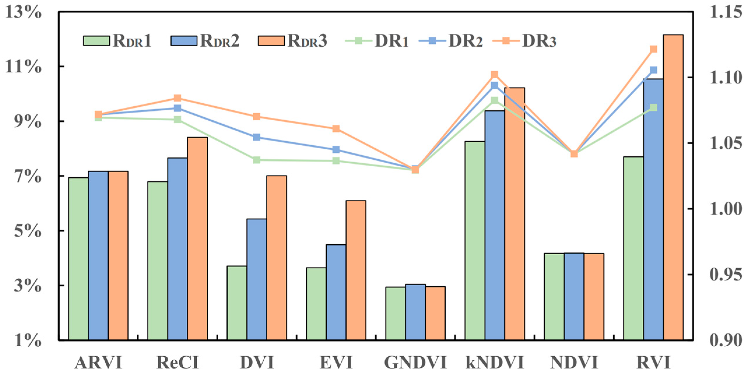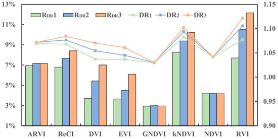 3.2.2. Single-Ratio Analysis of Vegetation Indices