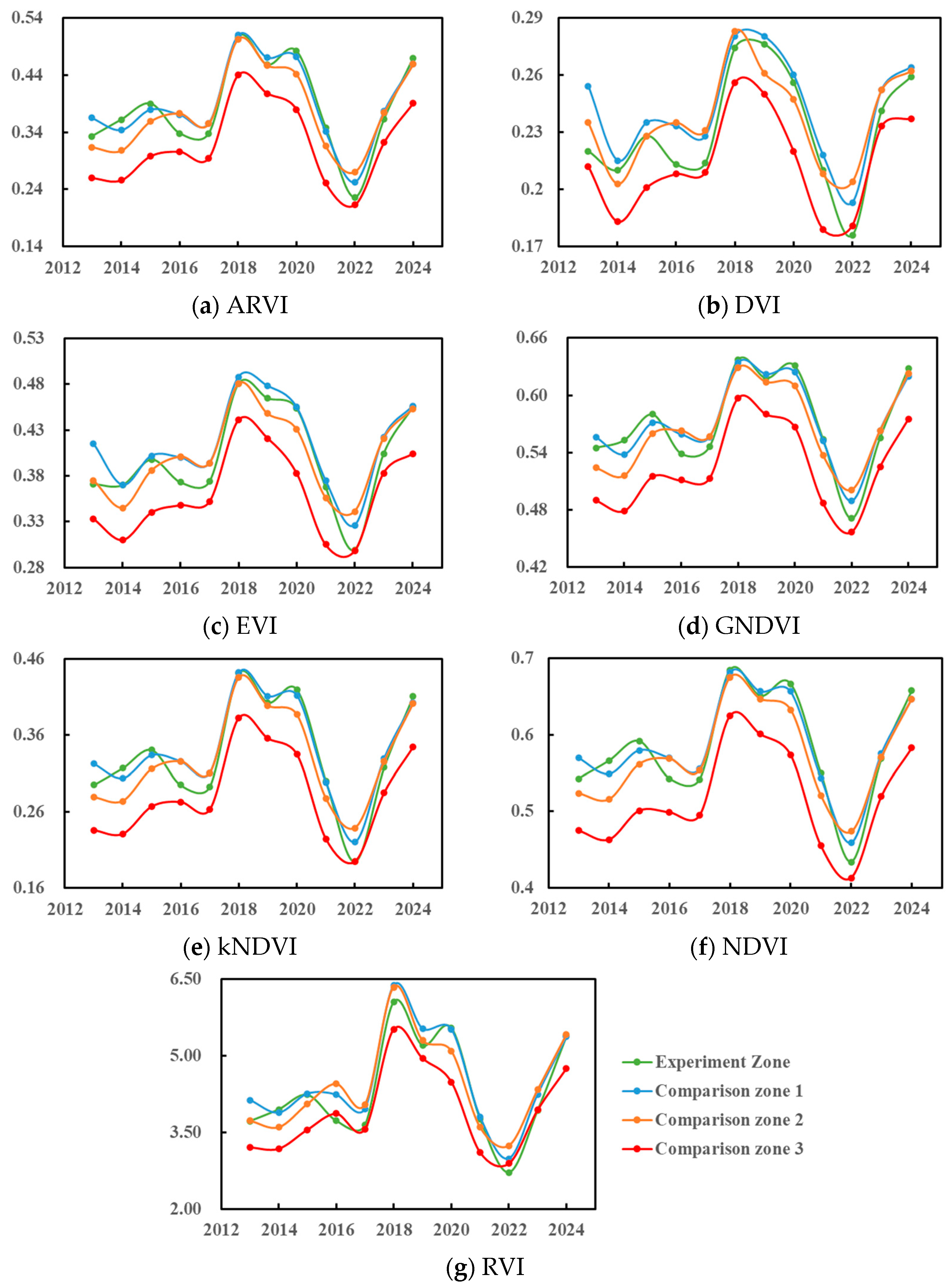 - In 2024, the percentage changes in indices such as kNDVI, RVI, and ARVI in the experimental zone compared to the non-enhancement baseline period were 32.13%, 30.28%, and 29.18%, respectively—significantly higher than those in the comparison zones. This confirms that acoustic rain enhancement technology not only effectively mitigates drought stress, but also markedly enhances grassland productivity and ecosystem service functions.