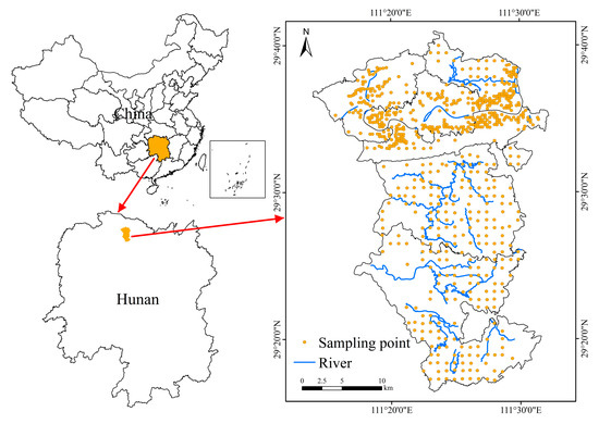 The research area is located in six townships in the southern part of Shimen County, Hunan Province, China (Figure 1). The study area is situated in a transitional monsoon climatic zone between central subtropical and typical subtropical regions, characterized by a mean annual temperature of 18.4 °C and annual precipitation of 1390.3 mm. Sampling was conducted in 2015, and a total of 673 sampling points were collected. A portable GPS was used to record the locations of sampling points. All the samples were stored in plastic bags and transported to the laboratory. The soil samples were air dried at room temperature, ground, and sieved through a 0.149 mm nylon sieve (200 mesh). Cd concentration was determined by inductively coupled plasma mass spectrometry (PE DRC-e, Waltham, MA, USA). The standard reference material (GSS-1, GSS-8) was used for quality control, and the recovery was within 100 ± 10%.