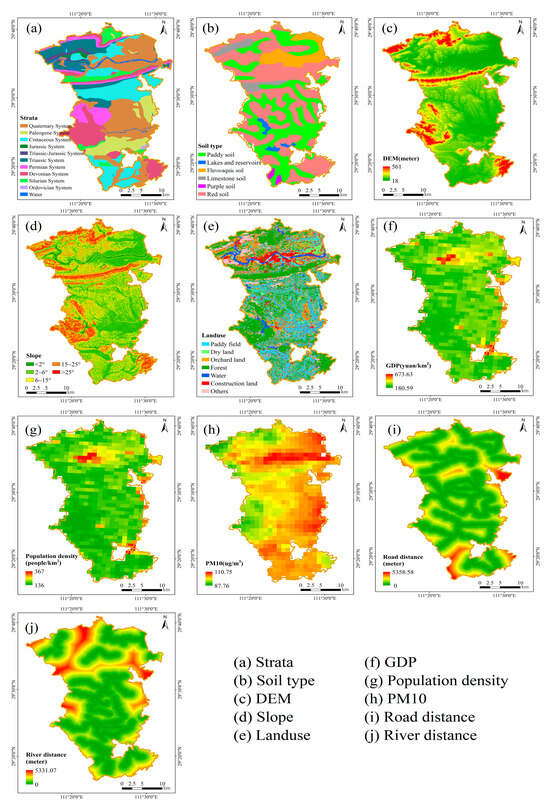 The data on potential driving factors in this study were obtained from the following sources: Geological formation data (1:200,000) was provided by the China Geological Survey. Soil type data, DEM (12.5 m resolution), GDP, and population density were obtained from the Resource and Environment Science Data Platform (https://www.resdc.cn/ (accessed on 25 June 2025)). Slope data were derived from DEM data using slope analysis in ArcGIS 10.8. Landuse data (10 m resolution) was obtained from Global Land Cover Data by Tsinghua University. PM10 concentrations were extracted from the China High Air Pollutants (CHAP) dataset, produced by the research team of Dr. Wei Jing and Prof. Li Zhanqing at the University of Maryland (https://zenodo.org/records/6449937 (accessed on 8 July 2025)). Road and river distribution data were primarily acquired from the National Catalogue Service for Geographic Information of China (https://www.webmap.cn/commres.do?method=result25W (accessed on 25 June 2025)).