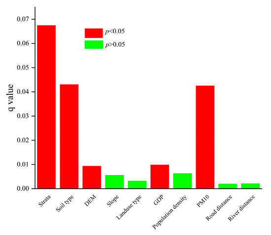 Geodetector analysis results (Figure 3) indicated that five factors—strata, soil type, DEM, GDP, and atmospheric deposition—exerted a significant driving influence (p < 0.05) on the spatial distribution of Cd in the study area, with q values ranging from 0.01 to 0.068. Among natural factors, strata (q = 0.068) and soil type (q = 0.045) demonstrated the most significant influence on Cd, while DEM (q = 0.010) also showed a driving effect. Regarding anthropogenic factors, atmospheric deposition (q = 0.046) and GDP (q = 0.010) also had significant impacts on Cd accumulation. In contrast, five other factors—slope, landuse type, population density, road distance, and river distance—showed no significant impact on Cd accumulation.
