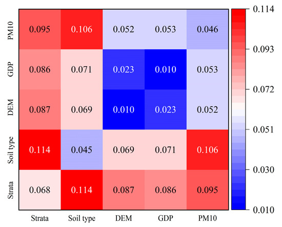 The interaction detector analysis within the Geodetector framework revealed significant interactions among different driving factors (Figure 4), all of which exhibited enhancement effects. A heatmap was employed in this study to visualize the strength of these interactions between factors (factors not statistically significant in the factor detector were excluded from the figure). Following interaction, the q values for the driving factor pairs ranged from 0.01 to 0.114. The strongest interaction was observed between strata and soil type (q = 0.114), followed by that between atmospheric deposition and soil type (q = 0.106). It is noteworthy that in the factor detector results, strata, soil type, and atmospheric dust deposition also demonstrated relatively high individual q values, highlighting their significant roles in Cd accumulation within the study area.