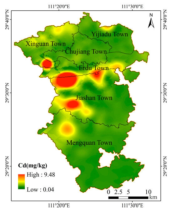 The spatial distribution of soil Cd in the study area was analyzed using Ordinary Kriging interpolation. Prior to interpolation, the semivariogram for Cd was fitted using GS+9.0 software. The Gaussian model provided the best fit, with a coefficient of determination (R2) of 0.69, a range of 3325 m, and a nugget effect of 10.27%. These fitting parameters indicated a very strong spatial autocorrelation of Cd within the study area [38]. As shown in Figure 5, high-concentration areas were found to be predominantly clustered in the central-western region of the study area, with Jiashan Town representing the main concentration zone. Elevated Cd levels were also observed in the northern region, encompassing Xinguan Town and Yijiadu Town. Although sporadic high-value pockets occurred in the southern Mengquan Town, Cd concentrations across this region were generally relatively low.