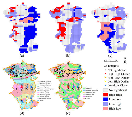Hotspot analysis was employed to identify spatial clusters (hotspots and coldspots) of Cd in the study area. By overlaying with strata and soil type data, the spatial correlations between Cd distribution and driving factors were revealed. The results showed that Cd hotspots were primarily concentrated in the northwestern and central regions, while coldspots dominated the northeastern, eastern, and southern areas. Spatial overlay analysis (Figure 6d,e) demonstrated a strong consistency between Cd hotspots and the two factors. For strata, Cd hotspots predominantly occurred in Permian and Triassic strata. In terms of soil type, they were mainly associated with limestone soil and paddy soil.