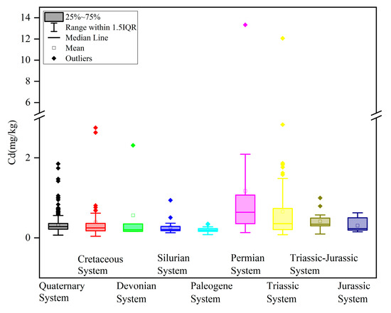 Boxplot of Cd contents in different strata.