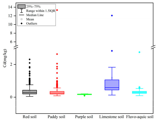 Differences exist in soil physical and chemical properties, such as pH value, organic matter content, clay particle content, and redox status among different soil types. These properties play an important role in the accumulation of heavy metals [24]. Therefore, the heavy metal contents may vary across different soil types [25]. The soil types involved in this study mainly include paddy soil, fluvo-aquic soil, limestone soil, purple soil, and red soil. Under the Chinese Soil Taxonomy (CST), the five soil types are classified as follows: paddy soil (Anthrosols), red soil (Ferralosols), limestone soil and purple soil (Primosols), and fluvo-aquic soil (Semi-aquic soils).