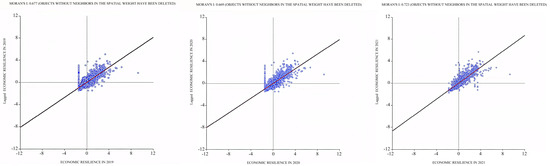 This study also focuses on the spatial autocorrelation analysis of economic resilience to reveal the spatial heterogeneity and resilience evolution process of regional economic development, providing a theoretical basis and empirical support for future policy design and regional development strategies. Generally, global spatial autocorrelation is used to analyze the spatial distribution pattern of data in the entire region, determining whether all regions show a unified spatial aggregation phenomenon. Moran’s I spatial autocorrelation index is one of the most common global spatial autocorrelation indexes, with values ranging from −1 to 1. A value closer to 1 indicates significant positive spatial autocorrelation in regional economic resilience, meaning that similar economic resilience or other variables tend to cluster geographically. A value closer to −1 indicates negative spatial autocorrelation, meaning that similar values are relatively dispersed. A value of 0 means that the data has no significant correlation in space and presents a random distribution [56]. The global autocorrelation index of this study is shown in Figure 3.