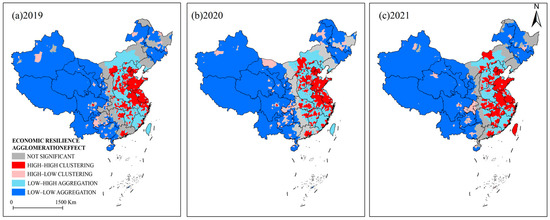 In addition, based on the economic data from 2019–2021, this study also uses the spatial autocorrelation analysis method and combines ARCGIS 10.8 to draw a spatial aggregation diagram of economic resilience of various regions in China in different years, as shown in Figure 4. In Figure 4, red areas represent regions with high economic resilience that are similar to their surrounding areas (“high–high” clusters), and blue areas represent regions with low economic resilience that are in line with their surrounding areas (“low–low” clusters). The light blue region and light red region show a “low–high” and “high–low” clustering pattern, respectively, with great differences in toughness from neighboring regions. The details are as follows: