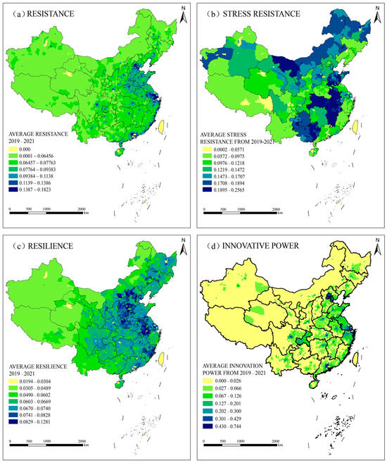 Spatial distribution of mean values of resistance, stress, resilience, and innovation in urban economic resilience in China (2019–2021).