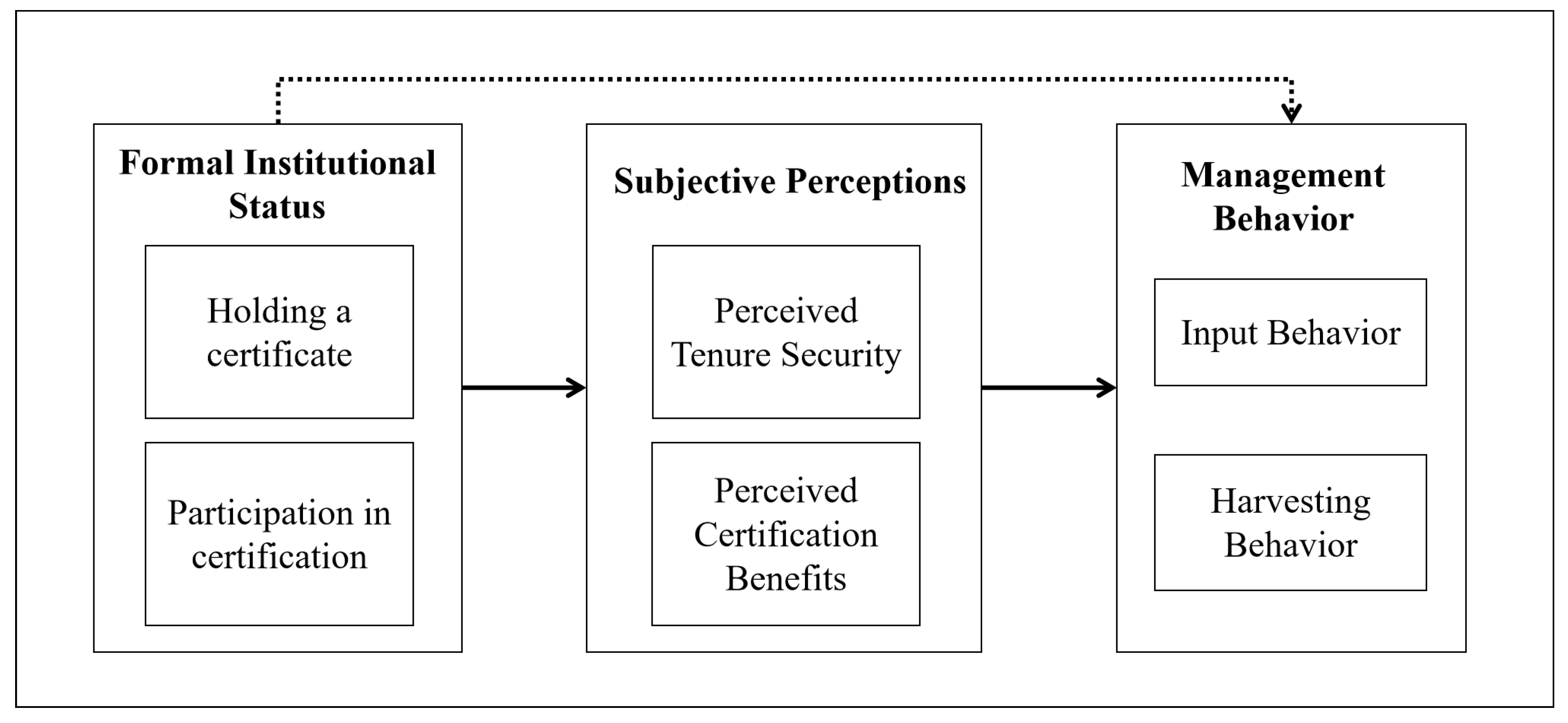 Integrating these dimensions reveals a key mediator in institutional incentives: subjective perceptions. The function of property rights institutions lies in constructing stable long-term expectations—not merely “certificate possession”; the efficacy of forest certification resides in shaping market value expectations—not binary “participation status”. This “perception-over-possession” logic has gained prominence in recent studies on institutional effectiveness and behavioral mechanisms [