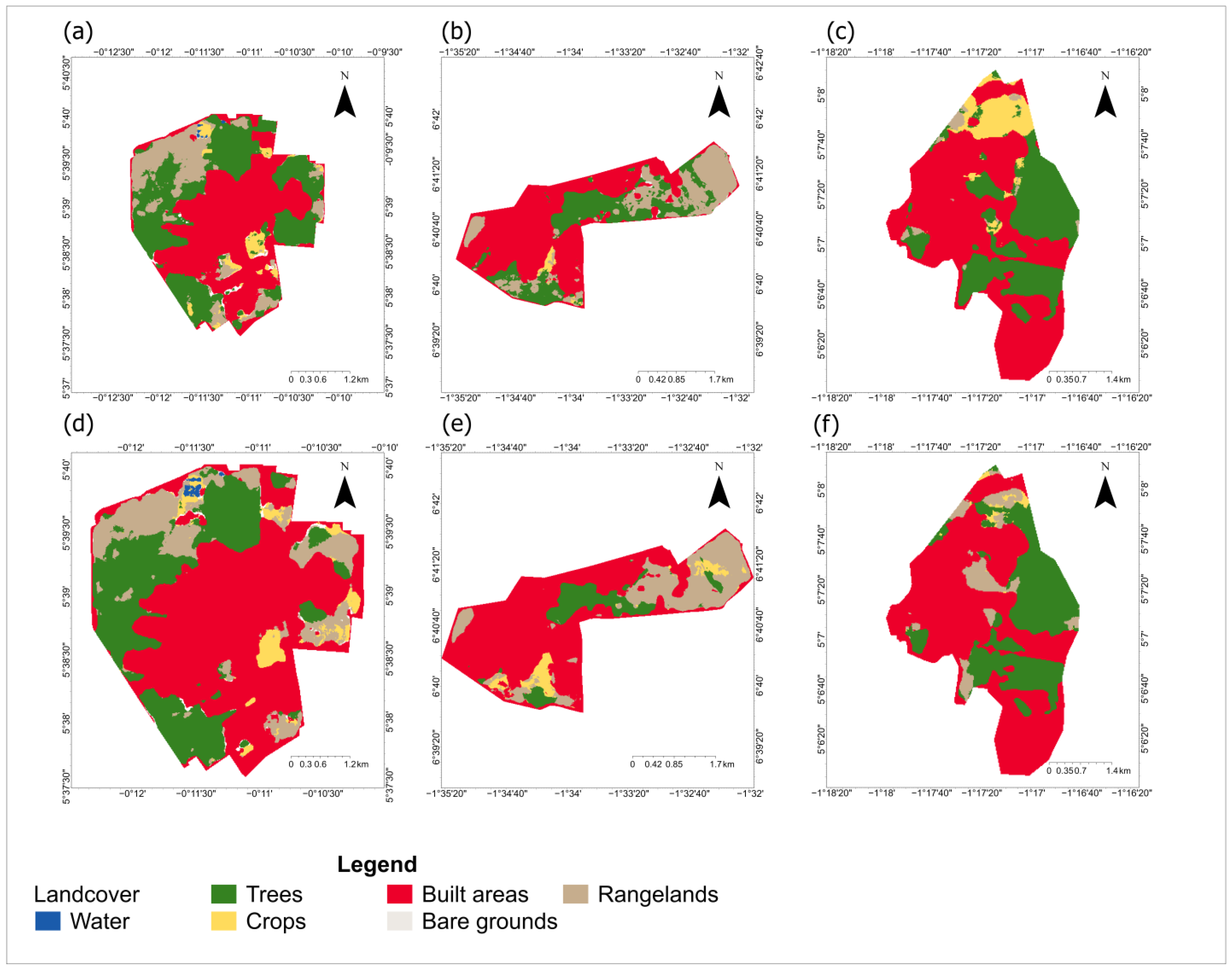 - Bilintoh, T.M.; Korah, A.; Opuni, A.; Akansobe, A. Comparing the trajectory of urban impervious surface in two cities: The case of accra and kumasi, ghana. Land 2023, 12, 927. [Google Scholar] [CrossRef]