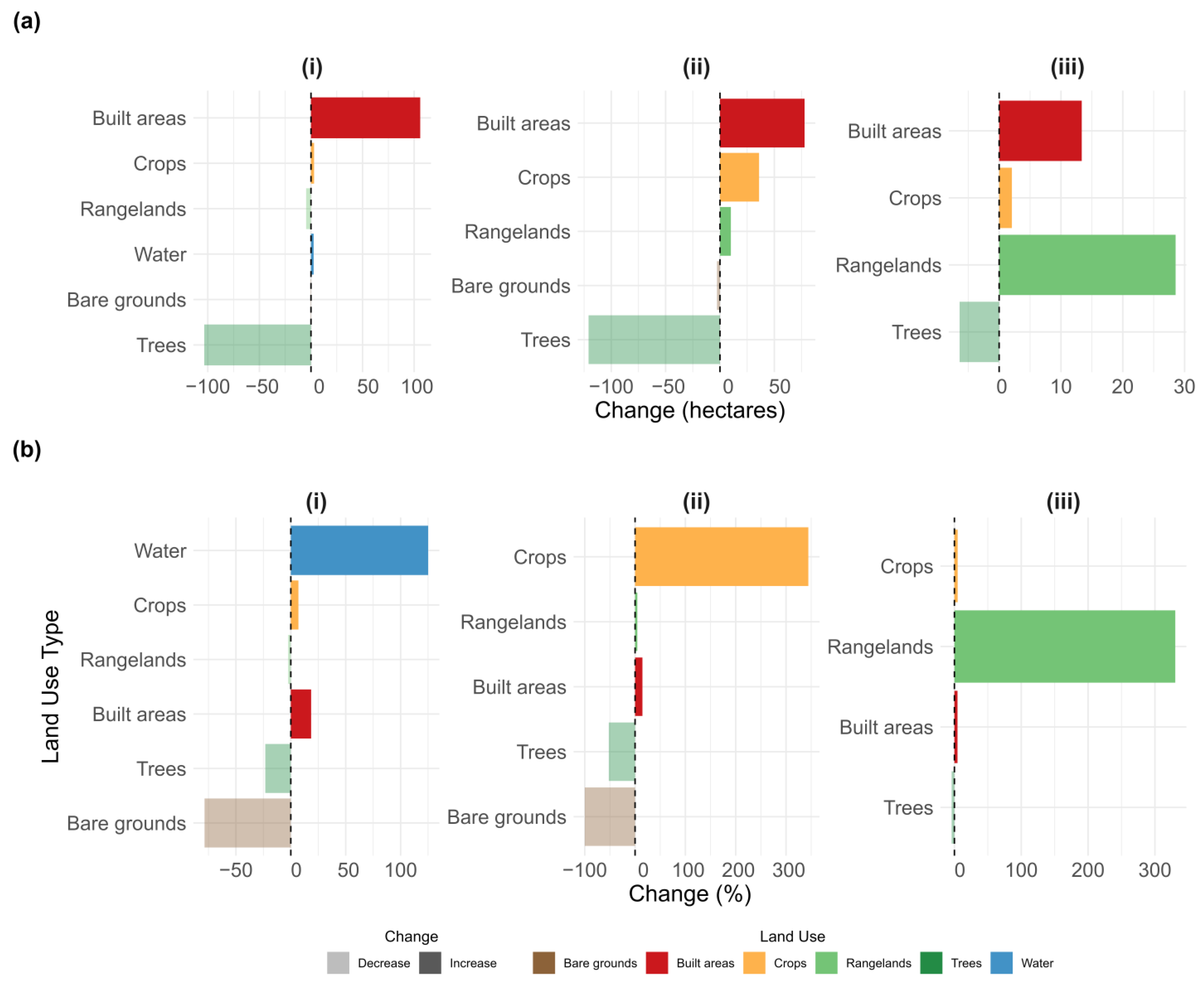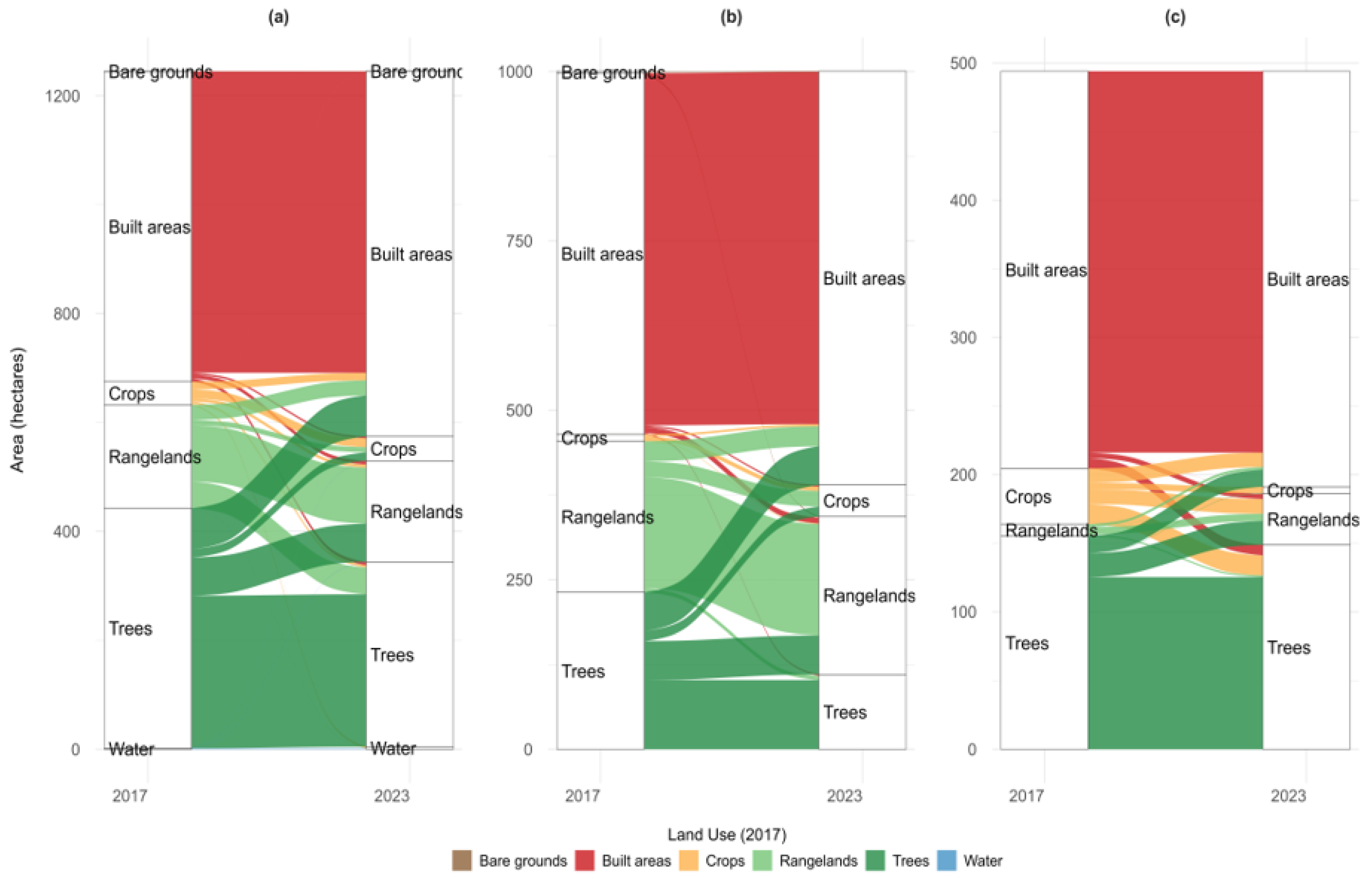 - InfraDev: This scenario simulates continued campus expansion through the conversion of natural areas to built infrastructure, a common pressure on Ghanaian universities. Forest and rangeland areas were designated as convertible land uses, with built areas as the replacement. Existing built areas were set as the focal land use. Maximum conversion was set at 10% of the existing built area coverage to reflect typical institutional expansion rates. Conversion followed the “nearest to edge” algorithm, simulating development sprawling outward from existing infrastructure.