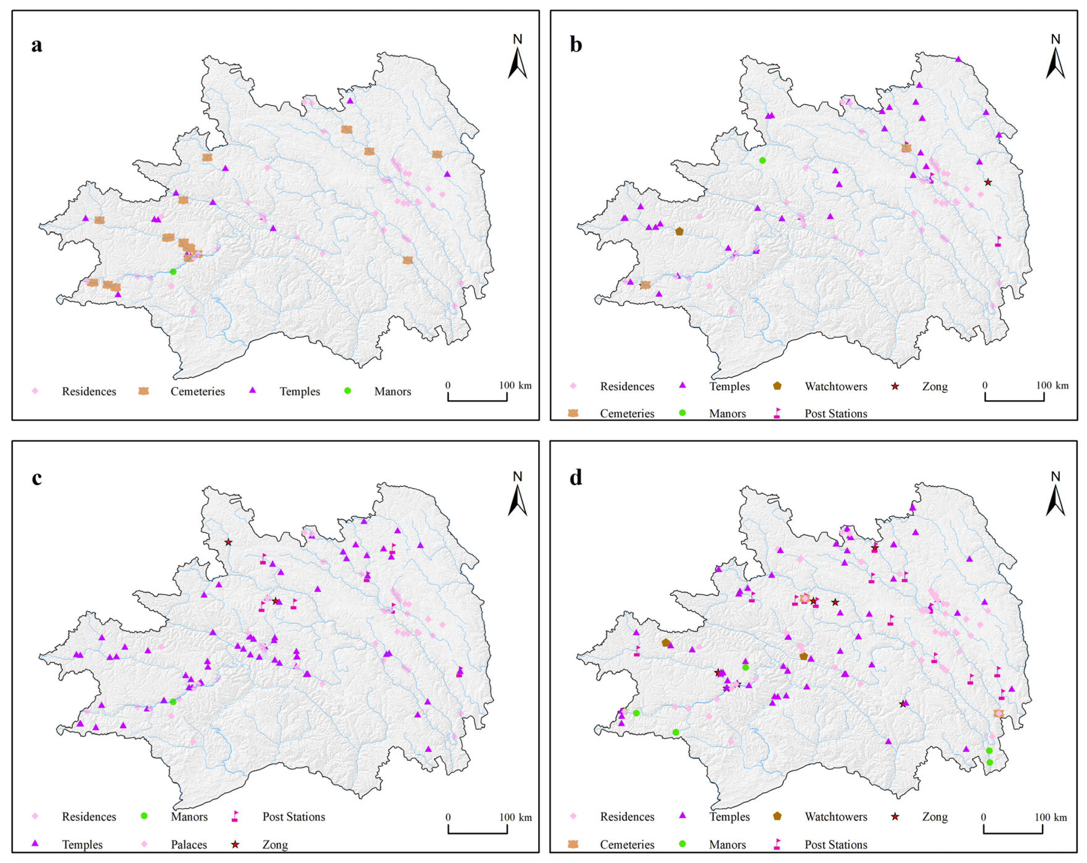We compiled and spatially processed historical data for various settlement types—including post stations, residential areas, temples, cemeteries, and watchtowers—dating from the Tubo, Yuan, Ming, and Qing dynasties in southeastern Tibet (