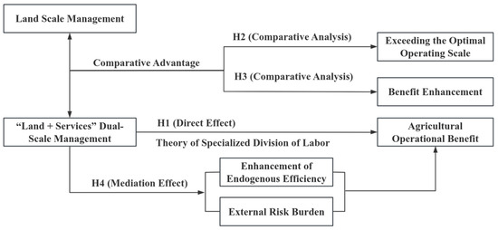 The essence of dual-scale management lies in the coordinated allocation of land and service factors, with its intrinsic logic for enhancing agricultural operational benefit rooted in several classical economic theories. This study constructs an integrated theoretical framework centered on the theory of division of labor and supported by transaction cost theory and economies of scale/scope theory, as shown in Figure 1. First, according to the theory of the economy of division of labor, land-scale management achieves horizontal division of labor and specialization through land transfers, aiming to achieve internal economies of scale. Service-scale management, meanwhile, leverages the divisibility of production processes to achieve vertical division of labor, targeting external economies of scale. Together, they form the complete structure of deepening agricultural division of labor, serving as the fundamental source of efficiency gains. Second, transaction cost theory indicates that concentrated land management reduces the frequency and cost of transactions for service providers seeking clients, while the integration of standardized services lowers negotiation and supervision costs for scale operators in technology and labor management. The “coupling” of these two effectively curbs the potential rise in transaction costs associated with scale expansion. Finally, economies of scale and scope theory reveals that dual-scale management, by restructuring the production function, not only expands the boundaries of economies of scale for factors like capital and technology beyond those achievable under single land-scale management but also realizes resource sharing and economies of scope through the cross-regional operations of service providers. This approach breaks through the efficiency ceiling that is inherent in single-scale models. Based on the above theoretical logic, this study proposes the following hypotheses.