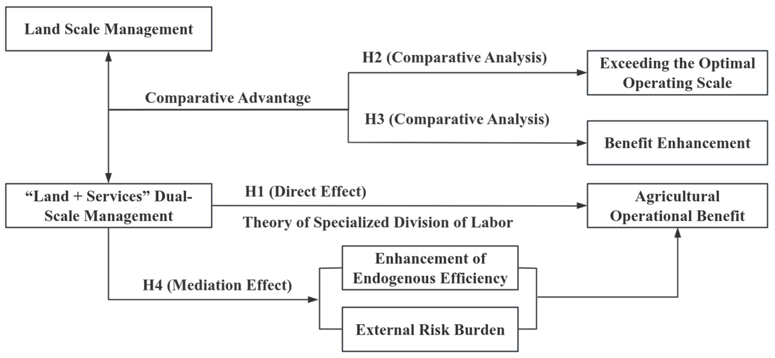 8]. The contribution lies in integrating these relatively independent pathways into a unified “dual-scale” framework, elucidating their combined effects. The efficiency enhancement mechanism originates from the land scale creating market demand for the service scale, while the service scale feeds back to improve land productivity through technology spillovers and factor substitution. The risk-sharing mechanism stems from the heightened risk awareness of dual-scale operators, which in turn fosters greater willingness to purchase insurance. This enables the broader dispersion and transfer of natural and market risks. The synergy between these two mechanisms constitutes the fundamental reason why dual-scale management enhances operational stability and sustainable profitability.