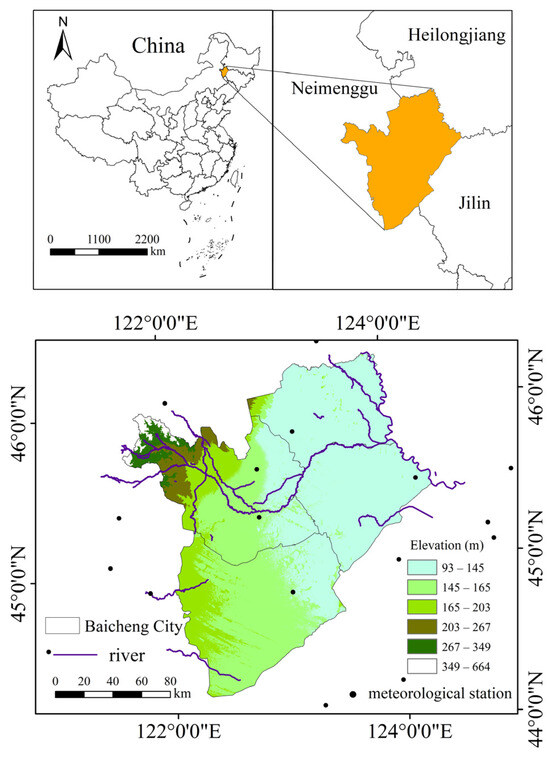 Baicheng City (121°38′–124°4′ E, 44°02′–46°18′ N) is located in the northwest of Jilin Province (Figure 1). It includes the western Nenjiang Plain and the eastern Horqin Grassland [33]. The city covers a land area of 25,800 km2, including five counties and urban areas: Zhenlai, Taonan, Da’an, Taobei, and Tongyu. Baicheng City has an undulating topography, which ranges from low mountains and hills to plains from northwest to southeast. The climate of Baicheng City is temperate semi-arid and semi-humid [34], with significant continental monsoon characteristics, simultaneous rain and heat, and significant precipitation variability, with an average annual precipitation below 450 mm in most areas [35]. The main soil types in Baicheng City are light chernozem soils, meadow soils, aeolian soils, saline soils, and alkaline soils [36]. The vegetation types is mainly grassland, including meadow grassland, steppe, and salinized meadow-steppe [35].