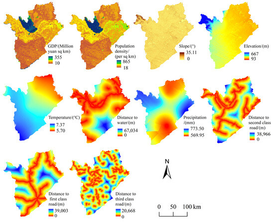 We selected 10 natural and socio-economic data, including slope, elevation, temperature, precipitation, population density, GDP, distance from waters, distance from first-class roads, distance from second-class roads, and distance from third-class roads as the driving factors (Figure 2), obtained the contribution degree of each land type expansion and generated the corresponding development probability.