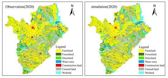 Comparison between observations (left) and the PLUS simulation (right) in 2020. The results indicated a good agreement between the observed and simulated patterns, demonstrating the model’s reliability for land use prediction.
