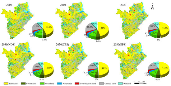Spatial patterns of land use in Baicheng city from 2000 to 2020, as well as in 2030 under three different scenarios. The pie chart represents the proportion of the area occupied by different land use types.