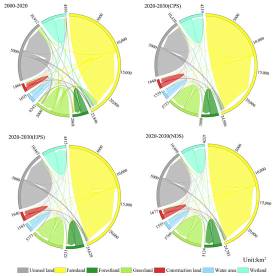 Under the EPS, cropland was predicted to increase by 144.94 km2, and forestland increased the most, by 153.02 km2. The water bodies and construction land increased by 82.64 and 5.3 km2 respectively. Unused land showed the largest decrease of 277.33 km2, followed by grassland and wetland, which decreased by 74.48 and 34.09 km2, respectively.