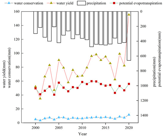 Annual precipitation, potential evapotranspiration, water yield and water conservation in Baicheng City between 2000 and 2020.