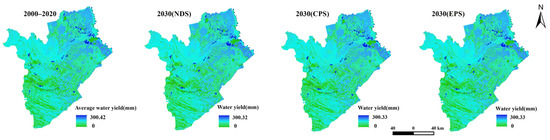 From 2000 to 2020, the water yield of Baicheng City fluctuated considerably but showed an overall increasing trend (Figure 6). The average annual water yield was 80.31 mm, with a maximum of 155.4 mm in 2020 and a minimum of 34.86 mm in 2001. By administrative division, Zhenlai County had the highest average annual water yield (100.34 mm), followed by Taobei District (91.20 mm), Da’an City (89.84 mm), and Taonan City (78.85 mm), while Tongyu County had the lowest (61.21 mm). In 2030, the water yield simulated under NDS, CPS, and EPS was 80.92, 81.51, and 80.51 mm, representing increase of 0.61, 1.2, and 0.2 mm, respectively.