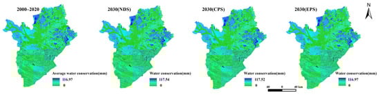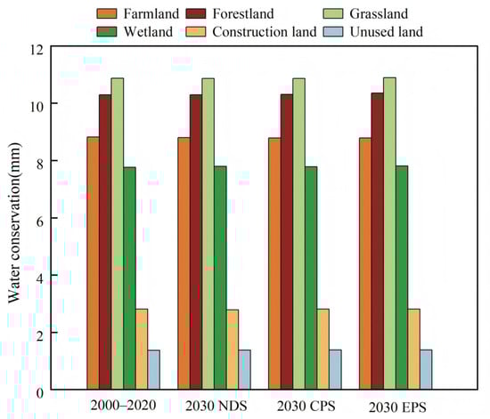 Under EPS, total water conservation was predicted to increase by 12.74 × 105 m3. Specifically, with increased in cropland (8.07 × 105 m3) and forestland (16.84 × 105 m3), and decreases in grassland (7.53 × 105 m3) and wetland (1.66 × 105 m3).