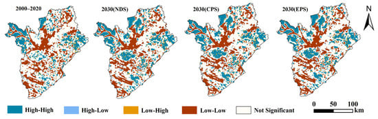 Spatial distribution of water conservation LISA cluster in Baicheng City for 2000, 2010, and 2020, as well as for 2030 under the Natural Development Scenario (NDS), the Cropland Protection Scenario (CPS), and the Ecological Protection Scenario (EPS). The LISA aggregation maps included five cluster types: high–high, low–low, high–low, low–high, and non-significant.