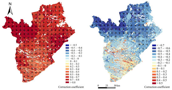 From 2000 to 2020, the Pearson correlation coefficient between water conservation and precipitation in Baicheng City (left), and the Pearson correlation coefficient between water conservation and potential evapotranspiration (right). Black plus signs indicated significant Pearson correlations with p < 0.05. Data visualization was performed using MATLAB R2024b software.