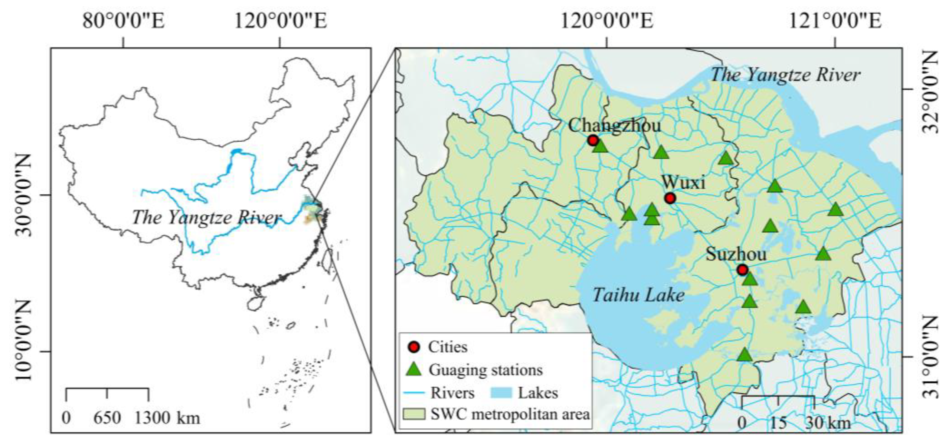 - Xu, Y.; Xu, Y.P.; Wu, L. Changes in river networks and their storage and regulation capacities in the rapidly urbanized Taihu Basin, China. Hydrol. Process. 2018, 32, 3341–3351. [Google Scholar] [CrossRef]